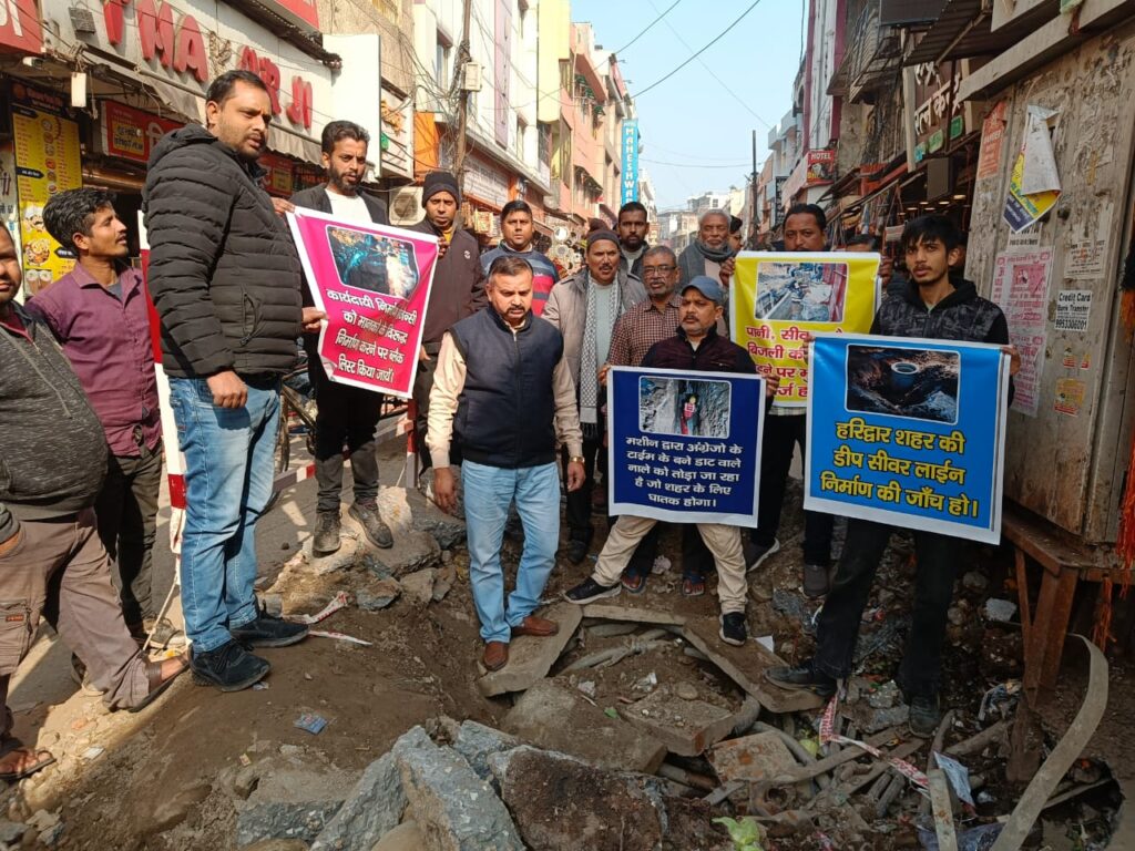सीवर लाईन निर्माण कार्य में देरी से हो रही परेशानी को लेकर व्यापारियों ने किया प्रदर्शन